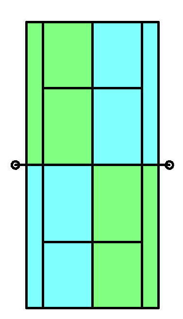 プレーヤー2名で行うシングルスなのですが、ダブルスコートのクロスの半面を使います。クロステニスのロゴマークで説明しますと、グリーンならばグリーンだけのエリア(デュースコート)、あるいはブルーならばブルーだけのエリア(アドコート)を使います。つまり絶えずクロスコートで打ち合う形となります。ボールを常にクロス方向の相手側ダブルスコート半面に返さなければならず、センターラインを外れてもアウトとなります。
