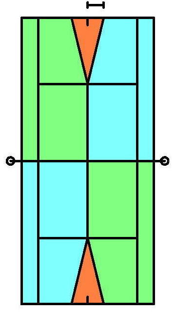 ここで問題となってくるのはセンターラインです。従来のテニスコートではサービスラインより外側にはセンターラインが引かれていないため、このエリアではイン/アウトの判定ができません。この部分に付加的なセンターラインを引く必要があるのですが、「センターラインを引くには」にいろいろとアイディアを挙げておきましたので、そちらを参考になさって下さい。